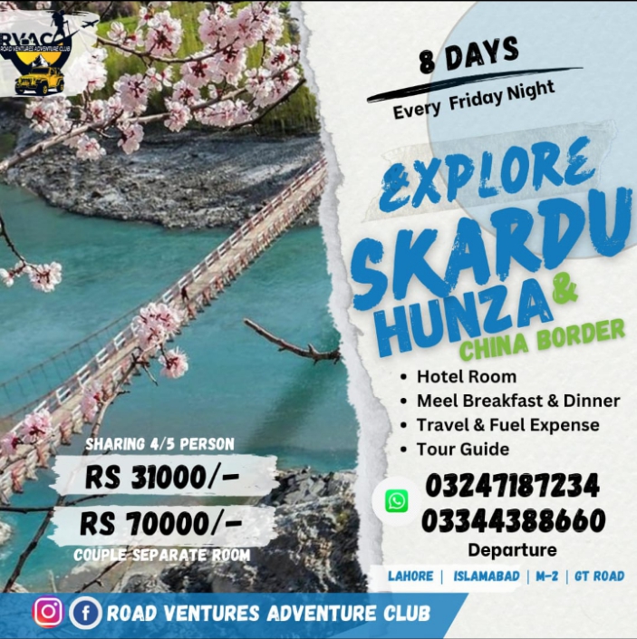Road Ventures Adventure Club Pvt Ltd presents the most discounted and the most awaited 8 Days Cocktail tour to visit Skardu Valley, Hunza Valley and Naltar valley ( 8 days 7 nights ) tour.